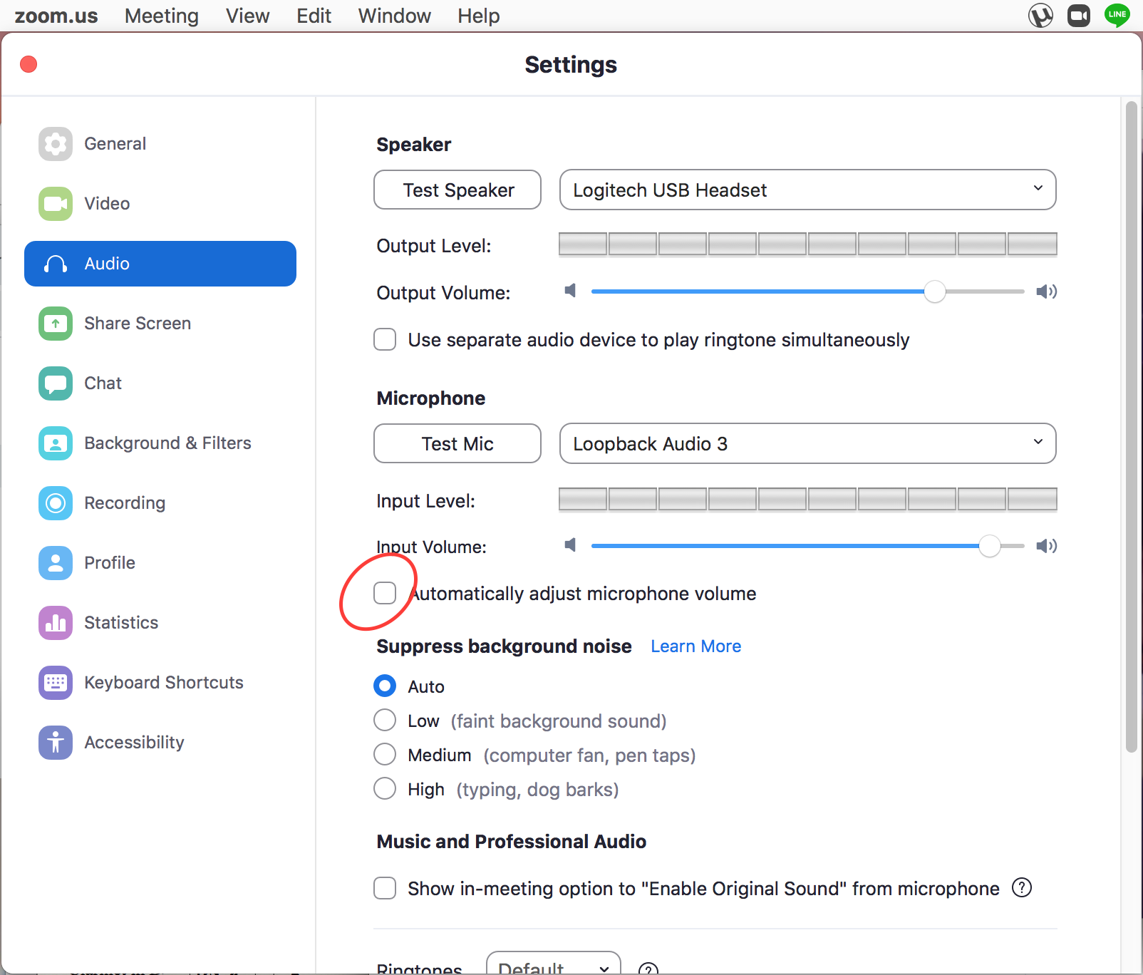 - Mac 電腦之聲音串界設定 (學生端若是 PC,通常可以不需要安裝 Loopback Audio 3):例如使用 Logitech USB Headset 為耳機與麥克風時,若要將音樂軟體聲音與對話的聲音同時即時透過 Zoom 傳送給對方的方法,最佳方式之一為 (1) 使用 Loopback Audio 軟體,將其 sources 設定為同時包含 ZoomAudioDevice、音樂軟體、Logitech USB Headphone (usb 耳機麥克風),並將其 monitors 設定為 Logitech USB Headset。(2)將音樂軟體的 audio driver 設定為 Logitech USB Headset。(3) 到 Zoom 中,設定 microphone 為 Loopback Audio,設定 speaker 為 Logitech USB Headset。(4)確認一下 System 中的聲音設定是否是 input 有設定為 Loopback Audio,output 設定為 Logitech USB Headset。